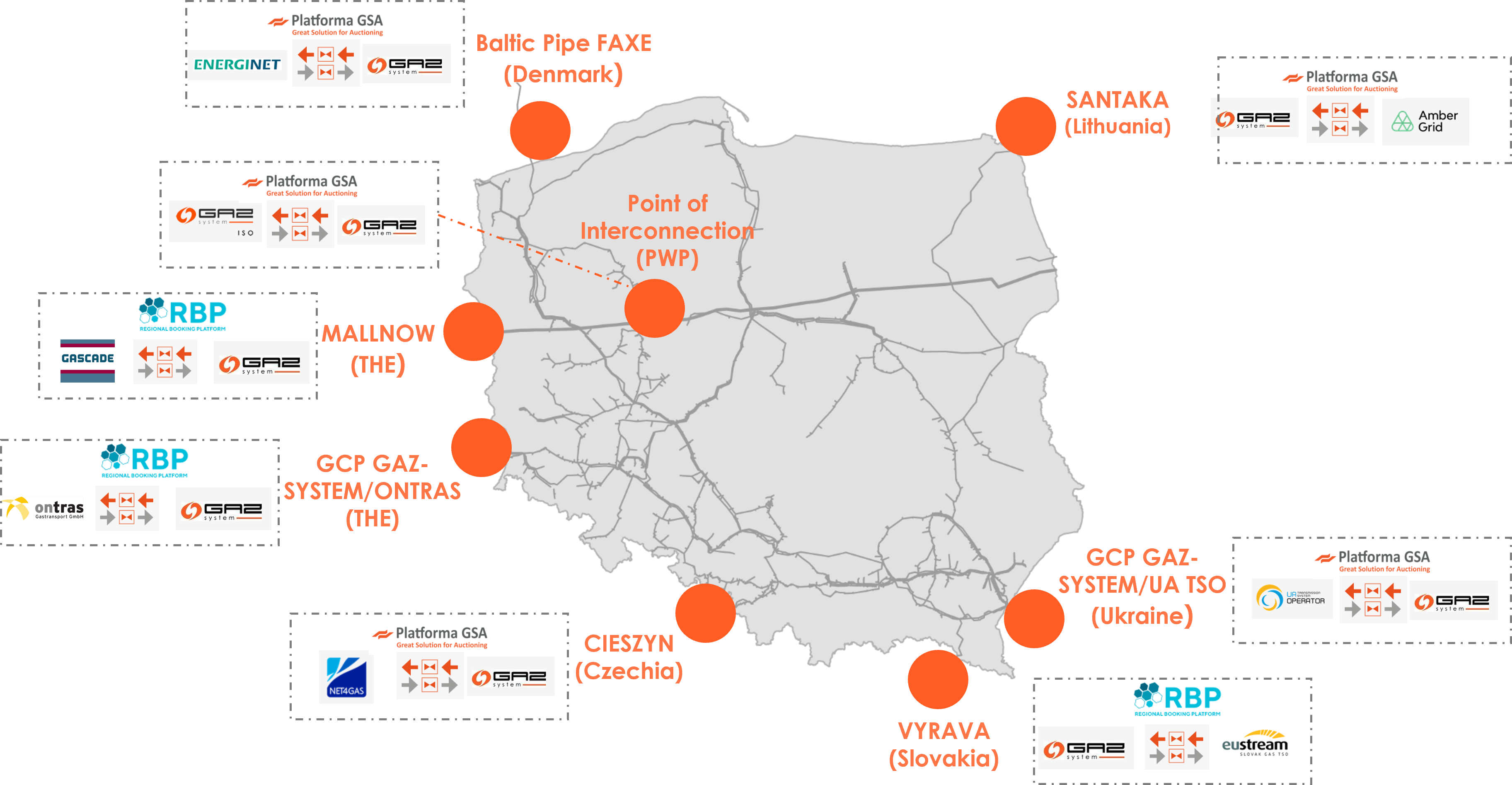Annual product auctions will start on 3 July 2023 at 09:00 CEST on two platforms allowing capacity booking at the interconnectors. Capacity allocation at the Polish-German border at the GCP GAZ SYSTEM/ONTRAS and Mallnow points as well as the Polish-Slovakian border at Vyrava will proceed via the RBP Platform. Capacity at the other GAZ-SYSTEM and GAZ-SYSTEM ISO interconnection points will be offered on the GSA Platform.