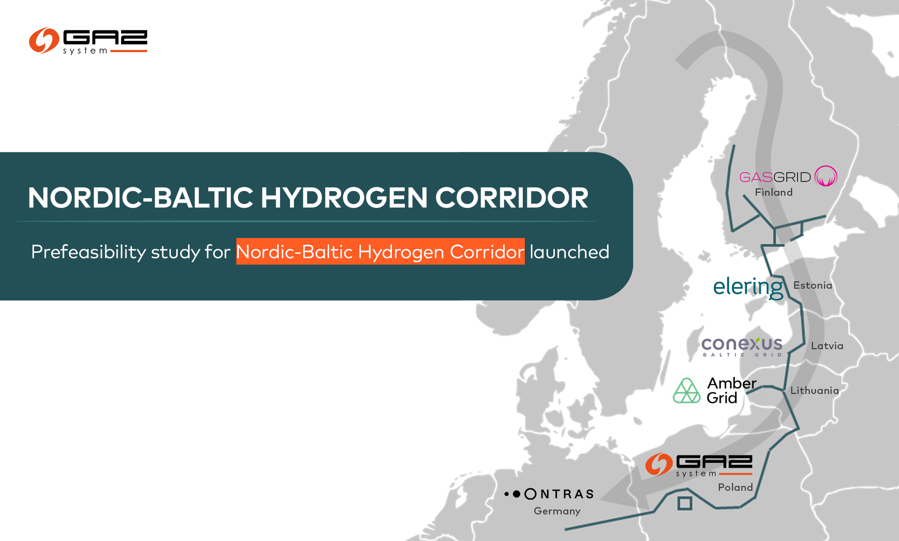 The European Gas Transmission System Operators: Gasgrid Finland (Finland), Elering (Estonia), Conexus Baltic Grid (Latvia), Amber Grid (Lithuania), GAZ-SYSTEM (Poland) and ONTRAS (Germany) participating in the international project for the creation of the Nordic-Baltic Hydrogen Corridor signed a contract for the preparation of pre-feasibility study on the green hydrogen corridor. AFRY Management Consulting, the tender winner, will analyse the conditions for the development of cross-border hydrogen infrastructure from Finland, through the Baltic countries and Poland to Germany, as well as green hydrogen trends in the region. It is planned that the study providing a comprehensive, fact-based framework to allow the optimal decisions to be made, will be prepared in six months, i.e. by mid-2024.