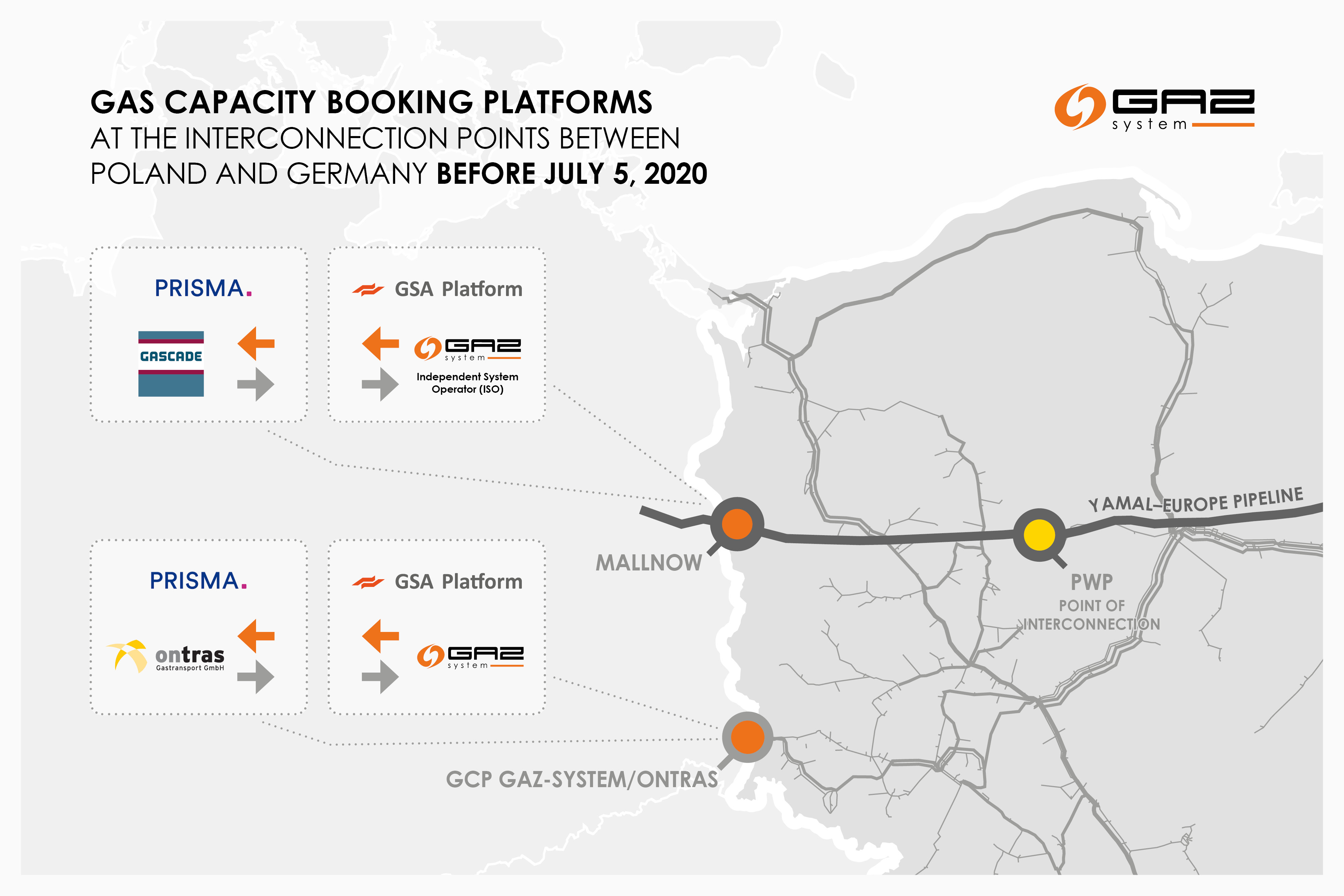 Details of the changes regarding the platforms for capacity booking at interconnection points at the border between Poland and Germany, used by GAZ-SYSTEM and GAZ-SYSTEM ISO until 5 July 2020 and as of the annual product auction to be held on 6 July 2020, can be found below.