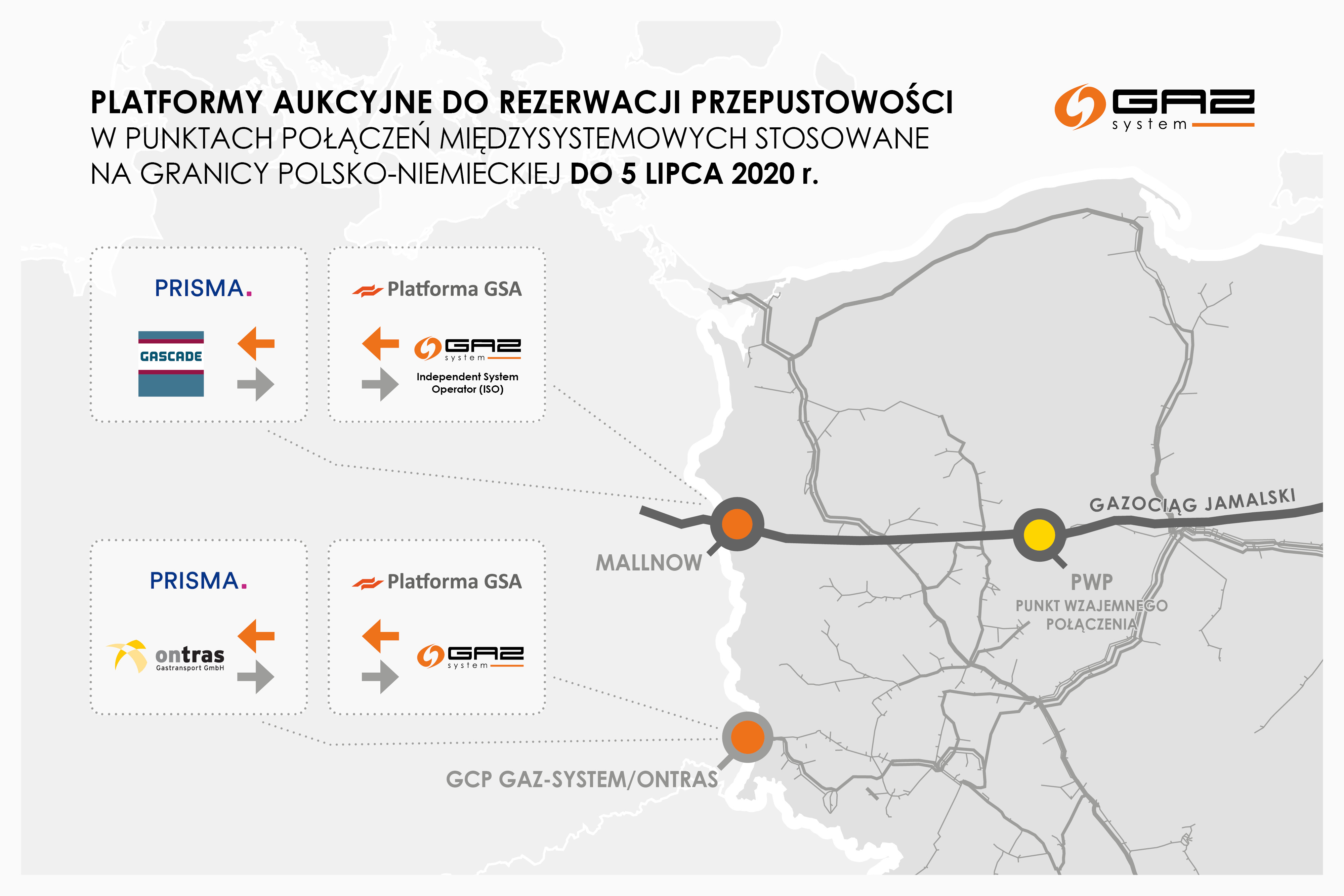 Poniżej zaprezentowano szczegóły zmian w zakresie platform do rezerwacji przepustowości na połączeniach na granicy Polska – Niemcy stosowanych przez GAZ-SYSTEM i GAZ-SYSTEM ISO do 5 lipca 2020 r. oraz od aukcji produktów rocznych, która odbędzie się 6 lipca 2020 r.